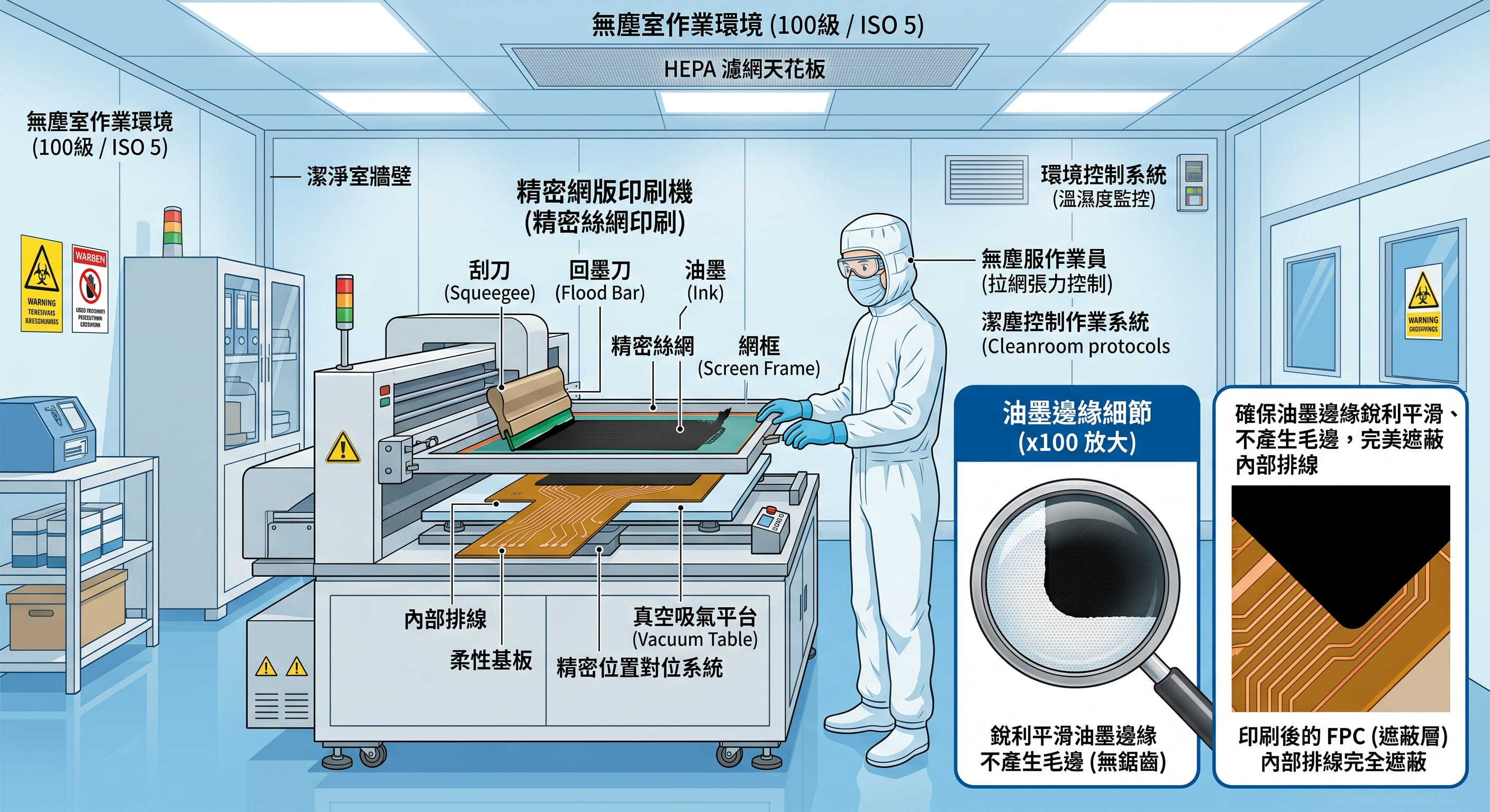 觸控螢幕的邊框印刷需要極高的尺寸穩定性。我們在無塵室等級的作業環境中,以微米級的精密網版印刷技術作業,確保油墨邊緣銳利平滑、不產生毛邊,完美遮蔽內部排線,同時避免油墨厚度不均干擾電容觸控的靈敏度。